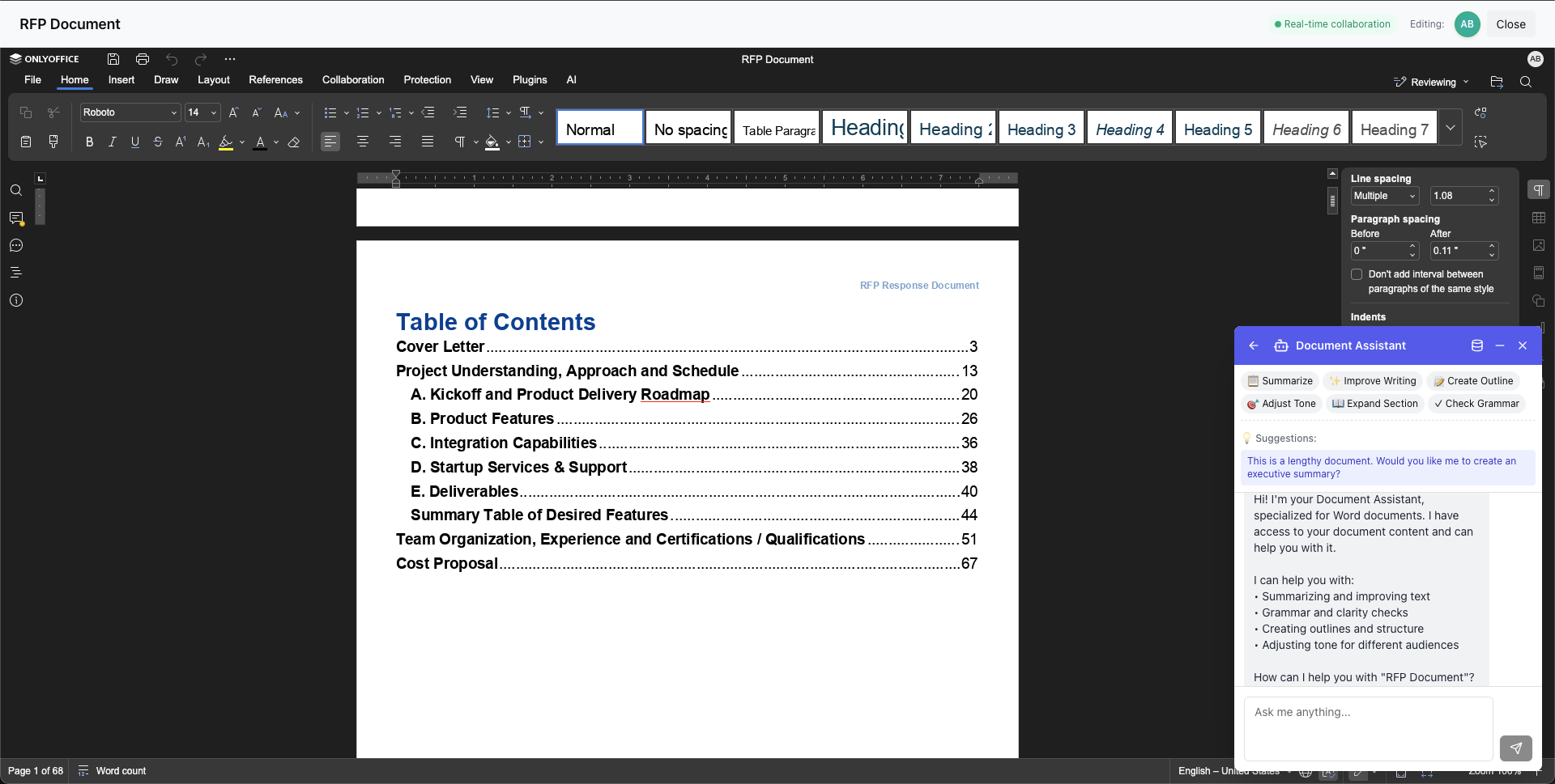 Generate documents from templates, then edit with professional tools via ONLYOFFICE—complete with real-time co-authoring and version history.